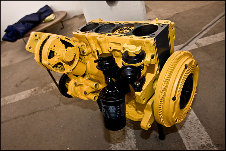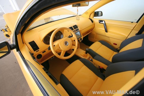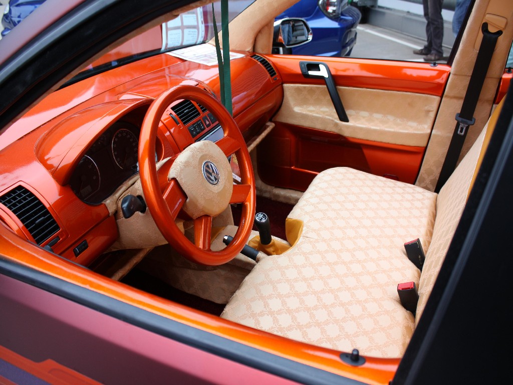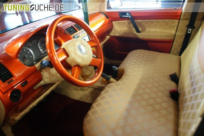 | Innenraum: | Alle Plastikteile im Innenraum teils in Orange mit Flakes lackiert oder bezogen, aufgepolsterte und durchgehende Sitzbank vorne, Handbremshebel verlegt, roter Teppich |